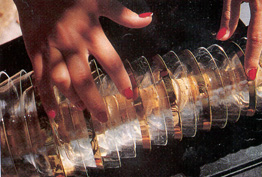 The original instrument consisted of sequentially sized lead crystal bells stacked on each other with an anchoring rod running through the center. A motor spins the rod, so they're in constant rotation. The 22•karat gold edges signify the black keys of a piano. The player wets her fingers and gently places them on the bells to create sounds in different pitches.